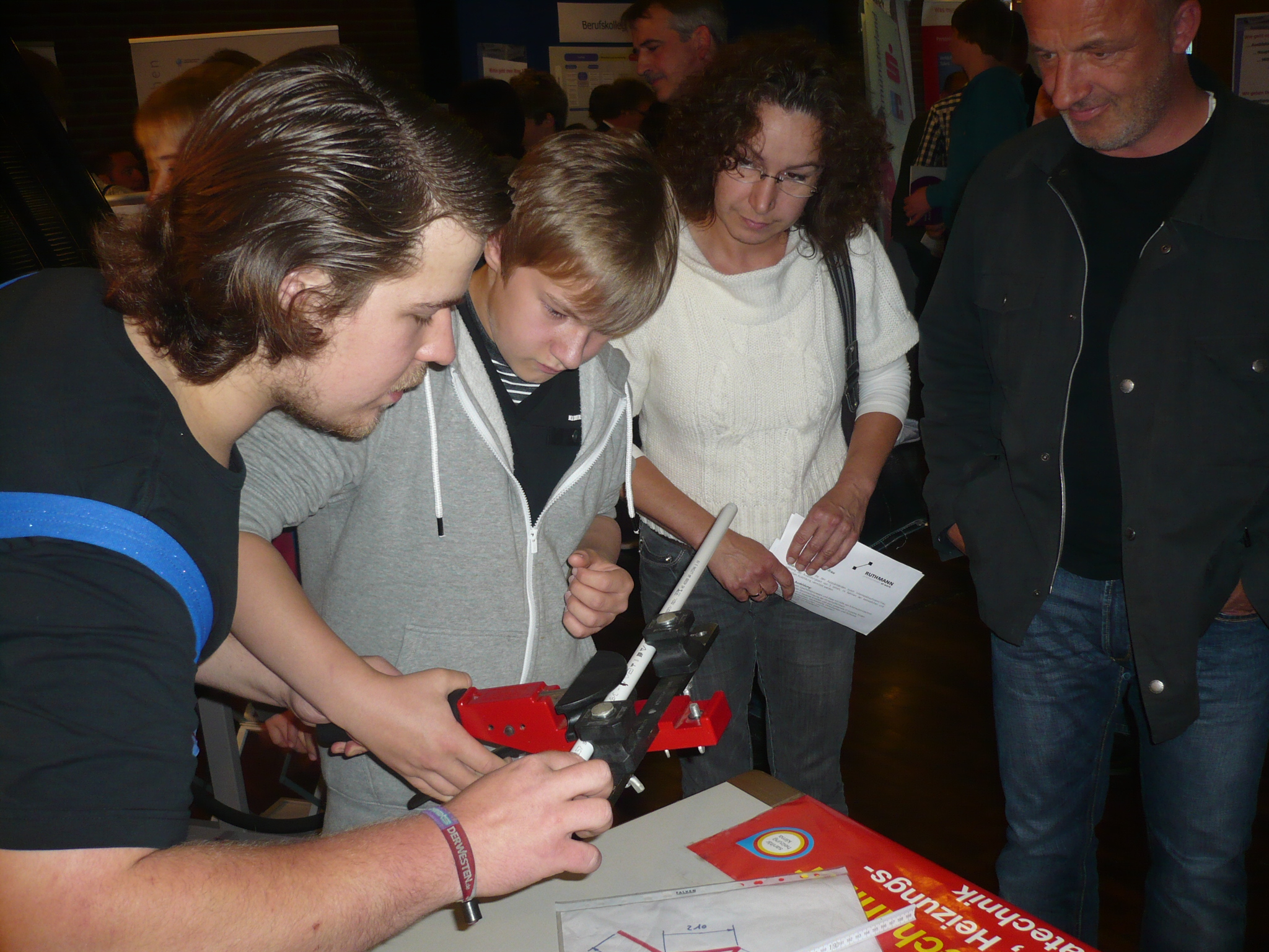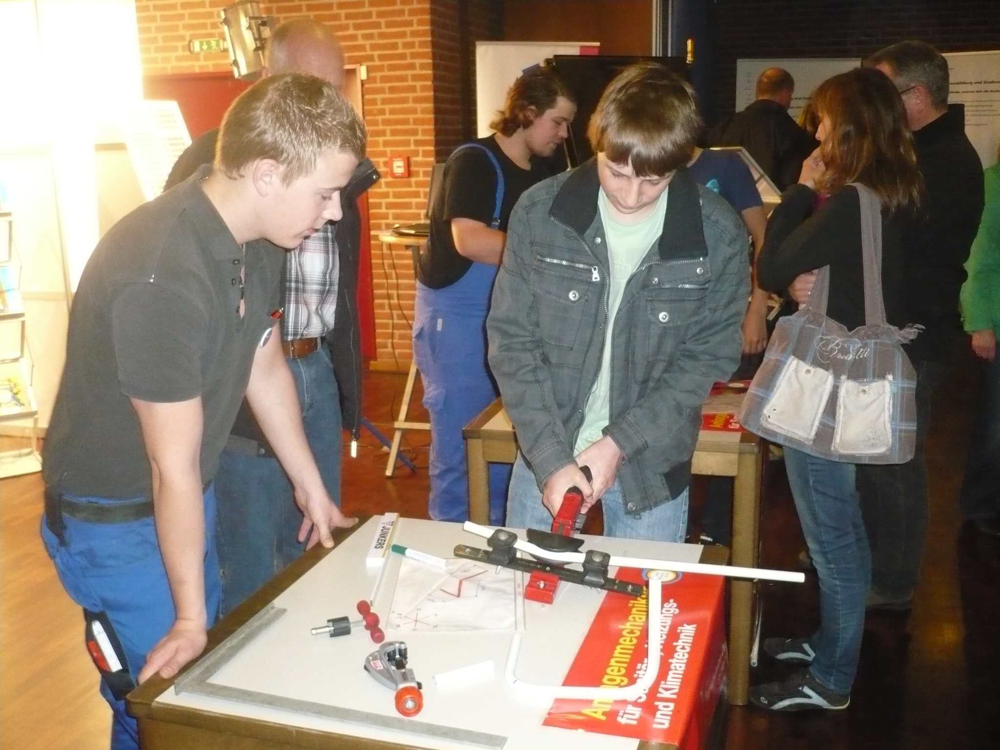Die Stände der Elektro-Innung Borken und der Innung für Sanitär- und Heizungstechnik Borken waren heiß begehrt. So konnten sich interessierte Jugendliche von Auszubildenden der Firma Rehms – welche stellvertretend für die Innung anwesend waren – den Beruf des Anlagenmechanikers erklären lassen. Dabei durften die handwerksinteressierten Schüler selbst Hand anlegen und sich z. B. beim Biegen eines Rohres versuchen.