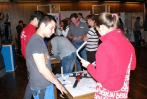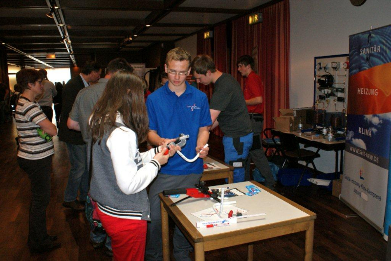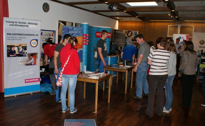 Auf der Berufsorientierungsmesse im Vennehof in Borken am Samstag, 02.06.2012, haben sich zahlreiche Jugendliche, vielfach mit ihren Eltern, über die Möglichkeiten einer Ausbildung informiert. Die von der Agentur für Arbeit organisierte Messe fand ebenfalls besonderen Zuspruch bei Firmen und Institutionen aus der Region, wie die große Zahl an Ausstellern zeigte. Aufgrund des derzeitigen Fachkräftemangels in vielen Branchen haben Jugendliche heute oft die Qual der Wahl bei freien Lehrstellen. Auf der Messe konnten sie aus erster Hand Orientierung für ihren beruflichen Lebensweg bekommen. Auch die Kreishandwerkerschaft Borken und die ihr angeschlossenen Innungen präsentierten sich eindrucksvoll. Firmenvertreter, Auszubildende, Vertreter der Berufsbildungsstätte Ahaus und Daniel Janning, Geschäftsführer der Kreishandwerkerschaft Borken standen dabei den Besuchern für Fragen zur Verfügung und informierten über Karrierechancen im Handwerk.