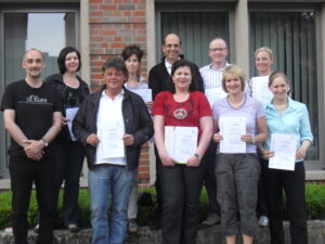 Im Rahmen des LEADER-Programms Bocholter Aa haben sich Unternehmer intensiv mit der niederländischen Sprache auseinandergesetzt, um so einen leichteren Markteinstieg in den Niederlanden zu erfahren. In der vergangenen Woche nahmen 13 Teilnehmer des 3. Fortsetzungskurses ihre Zertifikate entgegen. Dies bescheinigt ihnen nicht nur die Grundzüge der niederländischen Sprache, sondern auch Kenntnisse über die Eigenarten der niederländischen Geschäftsmentalität. „Het is een bijzonder clubje“, so der Sprachdozent Dirk Evers. „Zij kunnen alle tegen een grapje en hebben elkaar goed leren kennen“. So ist es nicht verwunderlich, dass dieser Kurs nun in die 4. Runde geht.