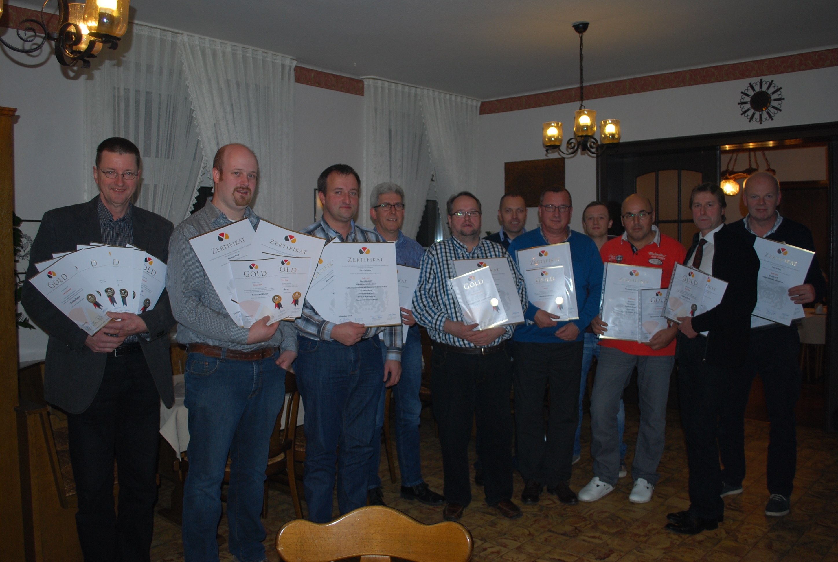 In diesem Jahr wurden während einer kleinen Feierstunde im Saal des Gasthauses „Pannen-Schulte“ in Wüllen folgende Bäcker die Goldurkunde als Anerkennung der gleich bleibenden sehr guten Qualität, vom stellvertretenden Innungsobermeister Karl Jöhne (Nienborg) und Geschäftsführer der Kreishandwerkerschaft Daniel Janning überreicht an: