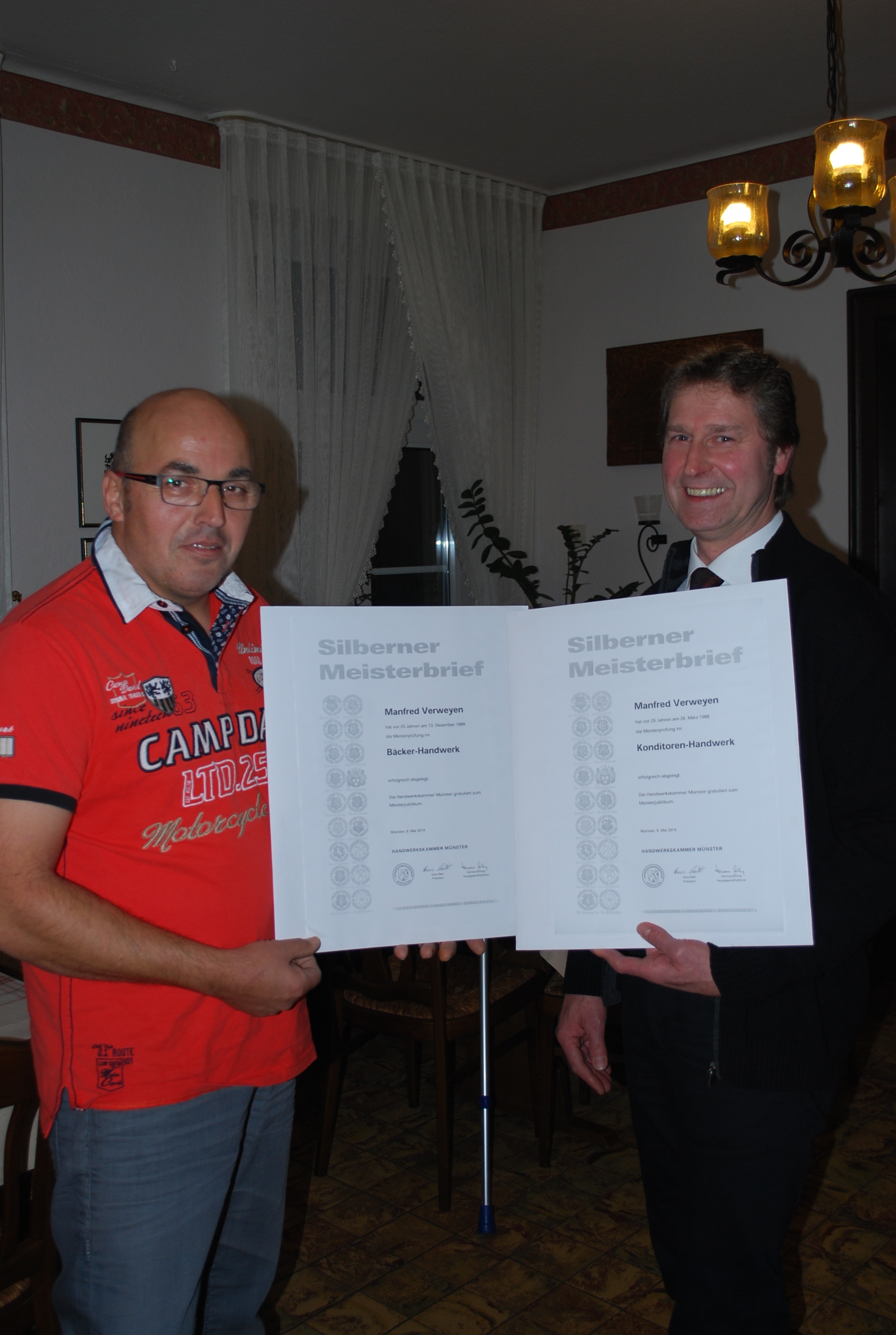 Ferner nutzte die Innungsversammlung dem Bäcker- und Konditoreimeister Manfred Terweyen (Ahaus-Wüllen) die „Silbermeisterbriefe“ im Bäckerei – und Konditorei Meisterhandwerk zu überreichen.