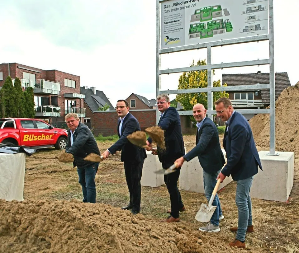 In einer emotionalen Rede stellte Wolfgang Büscher neben seinem Bruder Hans-Jürgen Büscher stolz das Pilotprojekt vor. Insbesondere ist hier hervorzuheben, dass es sich bei diesem Wohnobjekt mit 3 Wohneinheiten um eine absolute Innovation im Bausektor und in der Kreislaufwirtschaft handelt.