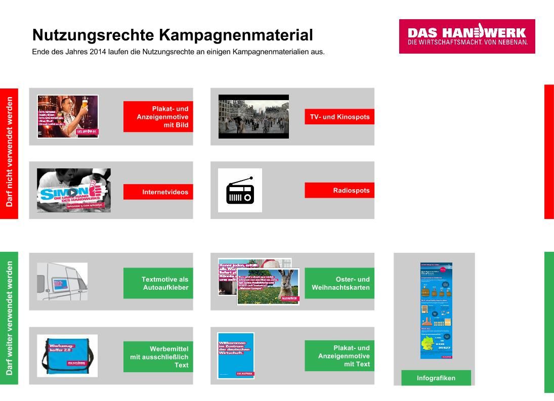 Hintergrund: Nutzungsrechte für Materialien mit Rechten Dritter, wie Fotos, Videos oder Tonaufnahmen, werden in der Werbung gewöhnlich für einen befristeten Einsatzzeitraum eingekauft. Nach diesem Zeitraum dürfen diese Materialien nicht mehr verwendet werden. So auch bei der Imagekampagne des deutschen Handwerks.