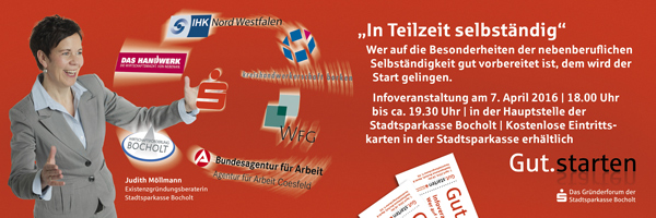 Informationsveranstaltung „In Teilzeit selbständig“ am 7. April 2016 um 18 Uhr in der Stadtsparkasse Bocholt, Markt 8, Veranstaltungsräume II. OG.