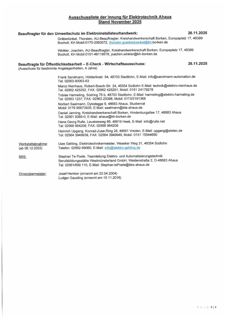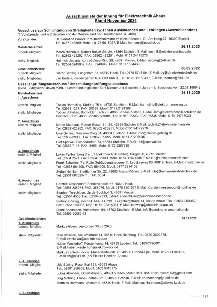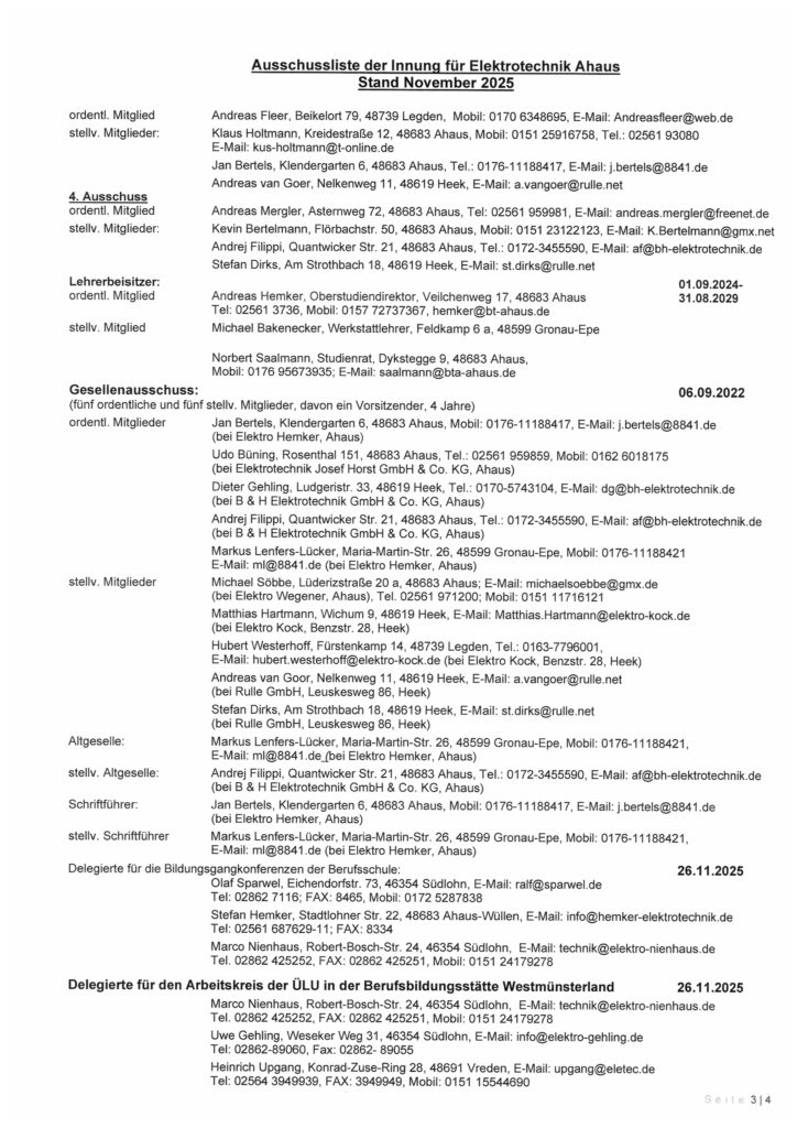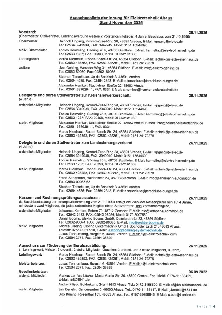 Vorstand und Ausschüsse der Innung für Elektrotechnik Ahaus (Stand Nov. 2021)