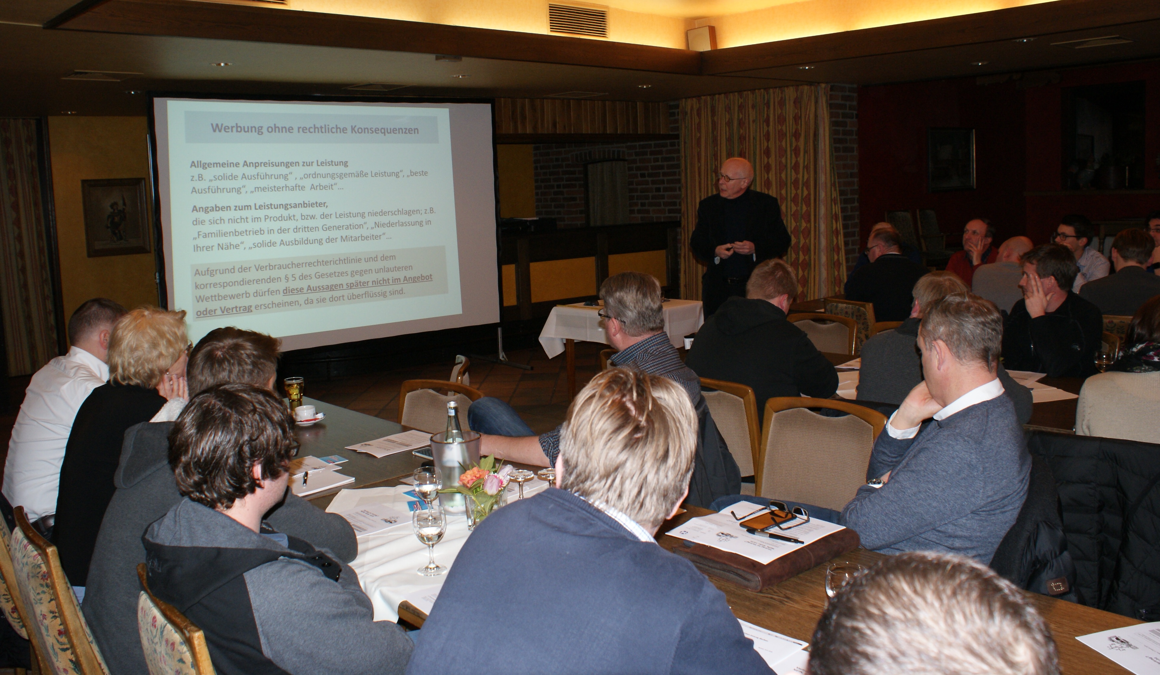 Bevor die drei Innungen ihre Mitgliederversammlungen im internen Teil jeweils für sich abhielten, stand für alle gemeinsam ein Vortrag zum Thema „Vertrag ist Vertrag? – NEIN leider nicht“ auf dem Programm. Der Referent Prof. em. Dr.-Ing. habil. Ulrich Nagel aus Mainz informierte die Anwesenden unter anderem über Mindestanforderungen von schriftlichen Verträgen, mündliche Verträge, Aufklärungspflichten, Rücktrittsrecht, Abschlagszahlungen und Nachtragsvereinbarungen.
