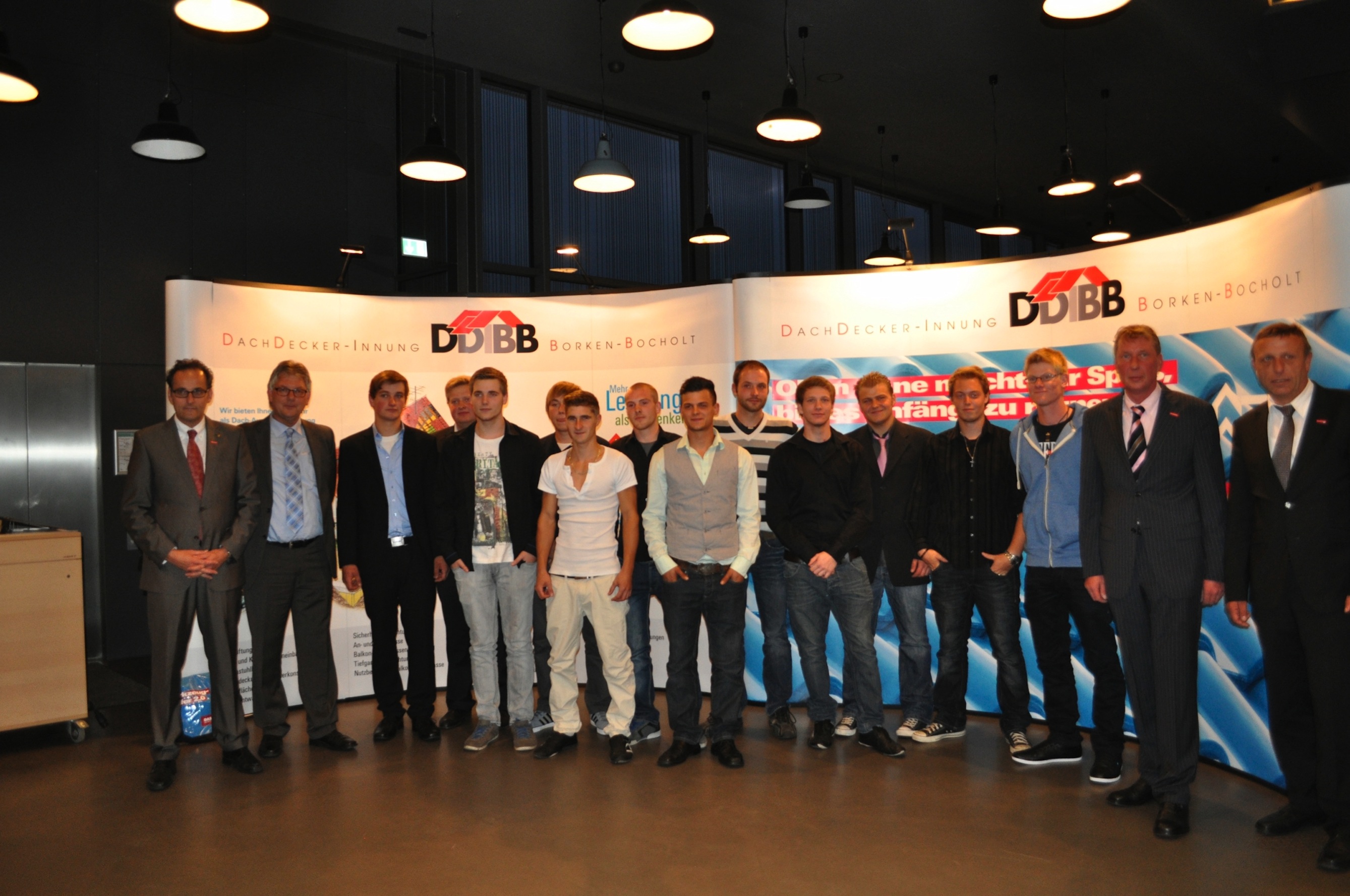 In der Sky-Lounge des Textilwerks Bocholt überreichte Herr Markus Schlatt, Obermeister der Dachdecker-Innung Borken-Bocholt zwölf frischegebackenen Dachdeckern ihre Gesellenbriefe. Mit der Gesellenprüfung nach 3-jähriger Ausbildungszeit legten sie den Grundstein für ihre berufliche Zukunft.