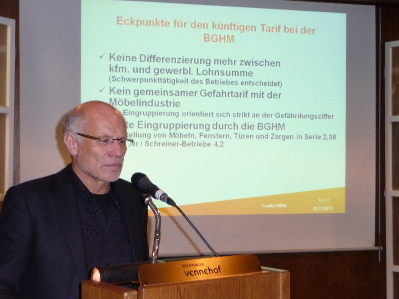 Die Neugestaltung von Gefahrtarif und Beitrag bei der neuen Berufsgenossenschaft Holz und Metall (BGHM) ab 2013 war das zentrale Thema der außerordentlichen gemeinsamen Innungsversammlung der Tischlerinnungen Ahaus, Borken und Bocholt am 12.12.2012 in der Stadthalle Vennehof in Borken.