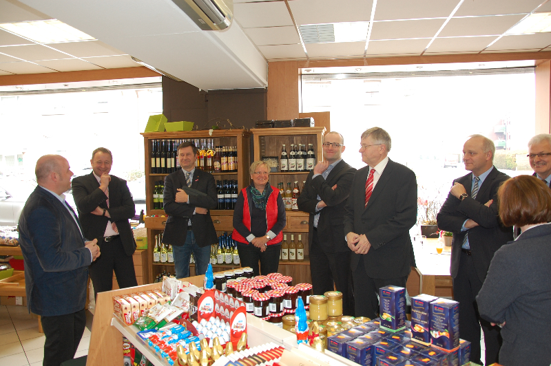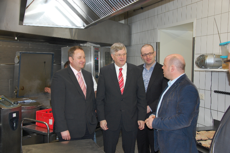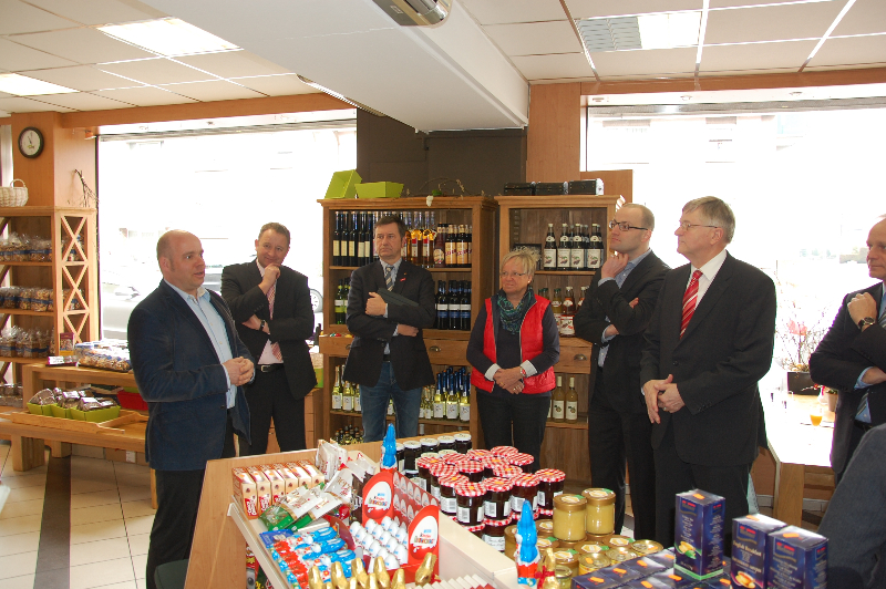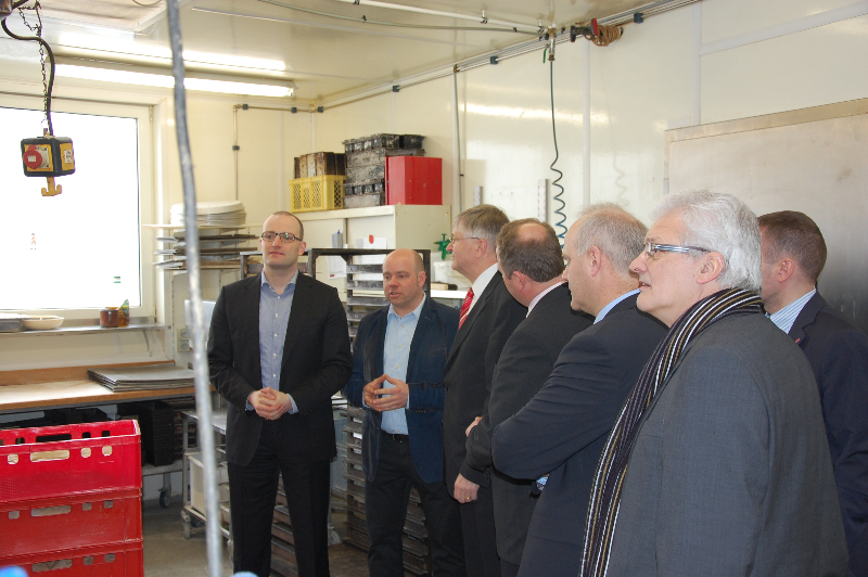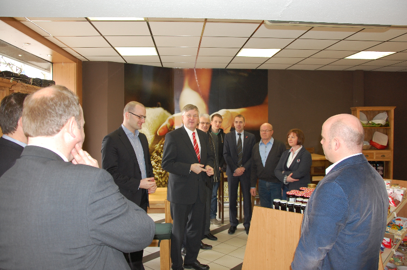 Besonderen Besuch begrüßte am Donnerstagmorgen Claus Duesmann in seiner Backstube: Der CDU-Politiker Dr. Peter Hintze (Bundestagsabgeordneter und Parlamentarischer Staatssekretär beim Bundesminister für Wirtschaft und Technologie) war in Gronau, um sich über den Handwerksbetrieb als Beispiel für mittelständische Unternehmen im Münsterland zu informieren. Mit dabei die Bundestagsabgeordneten Jens Spahn und Johannes Röring, der Landtagsabgeordnete Bernhard Tenhumberg sowie Vertreter der Kreishandwerkerschaft und der örtlichen CDU. Die Gäste zeigten sich von den Zahlen, die Claus Duesmann nannte, beeindruckt. Das Unternehmen hat 128 Mitarbeiter und 13 Auszubildende. Neben den Bereichen Bäckerei und Konditorei bietet das Familienunternehmen auch Catering an. „Catering für 1.000 Personen ist unser Standard, wir schaffen aber auch 2.000“, sagte Duesmann. Das Unternehmen wurde von Claus Duesmanns Großvater gegründet und feiert in diesem Jahr sein 75-jähriges Bestehen.