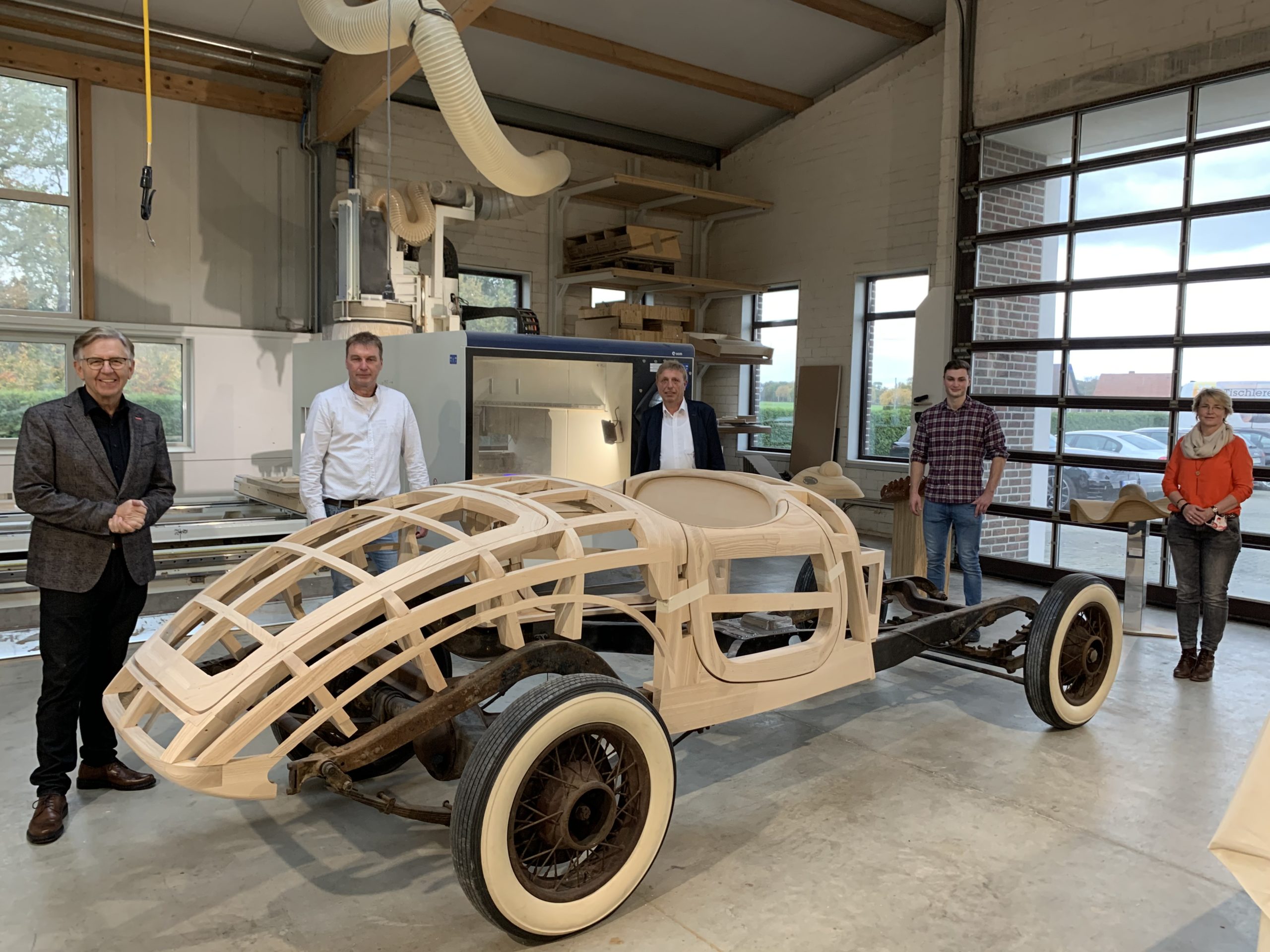 Mehr als 160 Stunden Programmier- und 220 Stunden Fräsarbeit brauchte das Projekt von Thomas und Niklas Cluse, um ein perfektes Ergebnis zu erzielen. „Unser Auftraggeber, Udo Fink, konnte keine andere Tischlerei finden, die diesen Auftrag durchführen konnte. Wir haben es uns zugetraut und wussten, dass wir es können“, so Thomas Cluse. Seit mehr als 30 Jahren kümmert sich Fink um ältere und meist extravagante Fahrzeuge.
