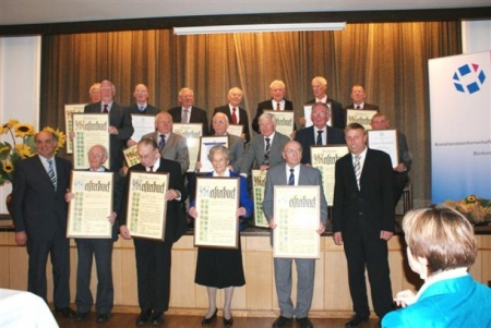 13 Goldene und 4 Diamantene Meisterbriefe überreichten Kreishandwerksmeister Alfred Marx und Hauptgeschäftsführer Christoph Bruns von der Kreishandwerkerschaft Borken an eine Handwerksmeisterin und 16 Handwerksmeister aus verschiedenen Berufen. „Was passt besser zum Modell der Sozialen Marktwirtschaft, als die Tradition der Meisterprüfung im Handwerk“.